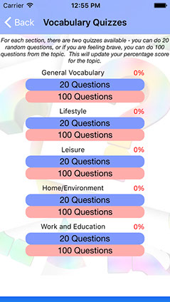 - Quiz section: Pick a topic and do either 20 or 100 questions to check your progress. If you do 100 questions, the app will update your overall progress for that topic, so you can see how you are improving.