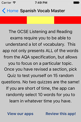 The GCSE Listening and Reading exams require you to be able to understand a lot of vocabulary. This app not only will teach you ALL of the words from the AQA specification, but also allows you to focus on a particular topic. Although it is designed for the AQA specification, it is still very useful if you are using a different exam board.